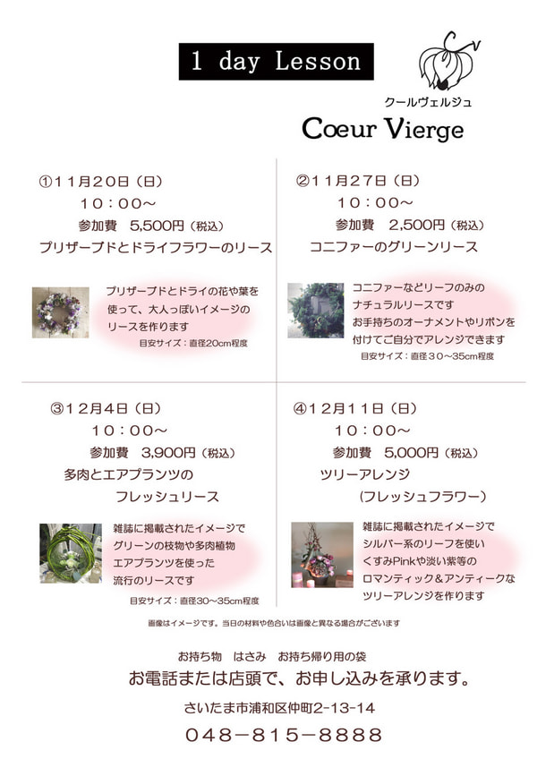 1day Lesson のお知らせ 2016 / 11 / 3 お待たせ致しました 🎶 クールヴェルジュの1day Lesson どのレッスンも素敵なリース…♡ 植物に触れ 温かいお茶をのみながらの のほほんレッスン ・所要時間は 1時間半です ・定員は各レッスン10名様を予定しております その他ご不明な点がございましたら お気軽にお問合せ下さいませ 【 当店に自転車置き場はございません 】